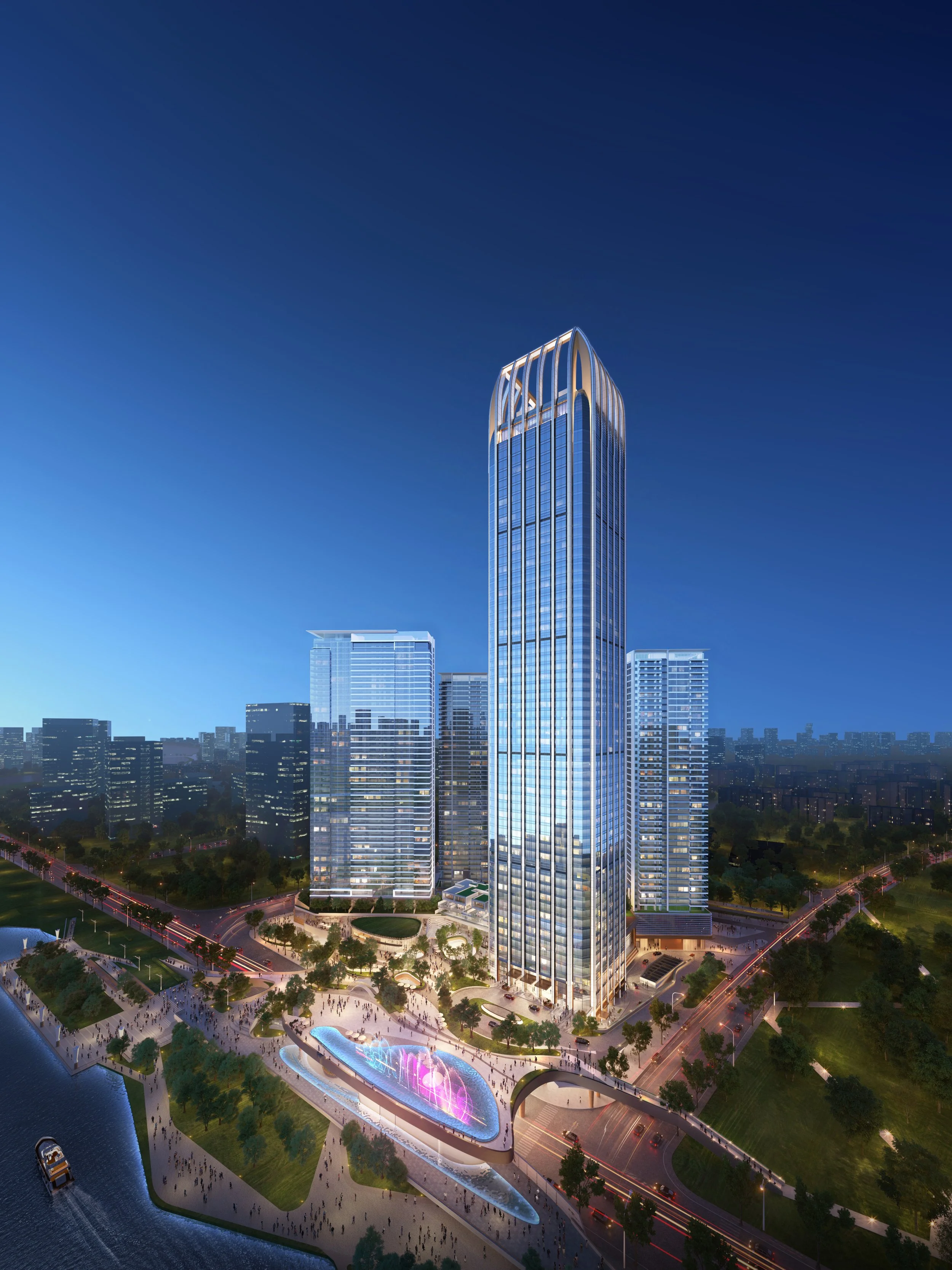 An array of residential towers in a mixed-use development along a branch of the Pearl River is anchored by a 267-meter landmark tower of ascending residential program, culminating in a hotel (operator to be announced). This luxury hotel is given sweeping views of the waterfront and cultural district to the south and adorned with a colonnade of vertical piers, becoming the “Crown of Foshan.” Those piers stretch downward to the ground level, uniting the hotel and residential program. Concealed within the slender tower is a series of stacked interior atria between two split cores, a novel design solution to address the owner’s desire for square hotel bays and exciting interior space.